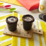 Oreo shots ko molds mein sa nikal lein aur oreo shots glasses ki rims ko cream mein dip ker ka crumbled oreo biscuits mein coat ker lein.