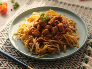-Serving plate mein tayyar egg noodles,marinara sauce aur cooked chicken dal ker serve karein!