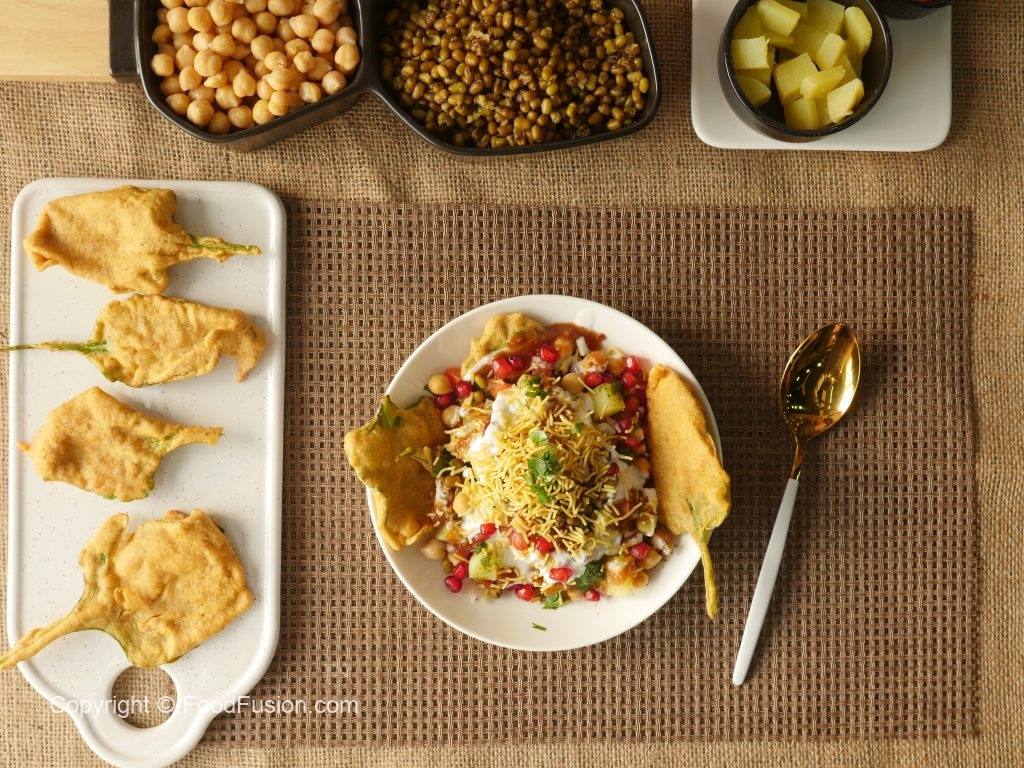 Platter mein palak pakora,hari mong daal,chanay,aloo,pyaz,tamatar,dahi,tayyar hari chutney,tayyar khatti chutney,nimco sev,anaar,lal mirch crushed,chaat masala aur hara dhania dal ker serve karein.