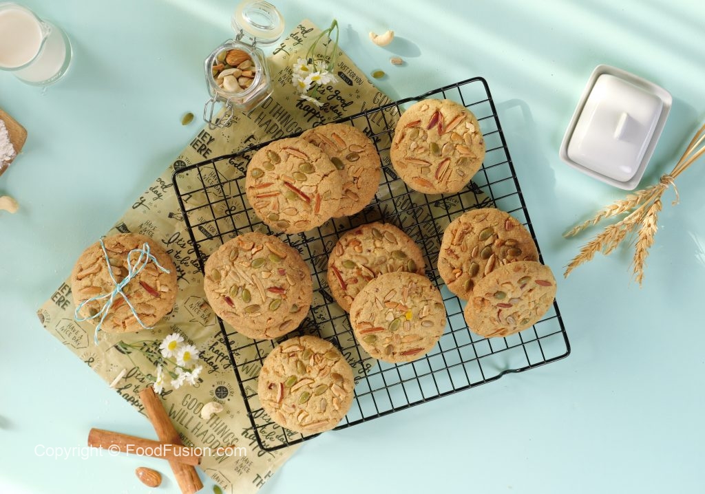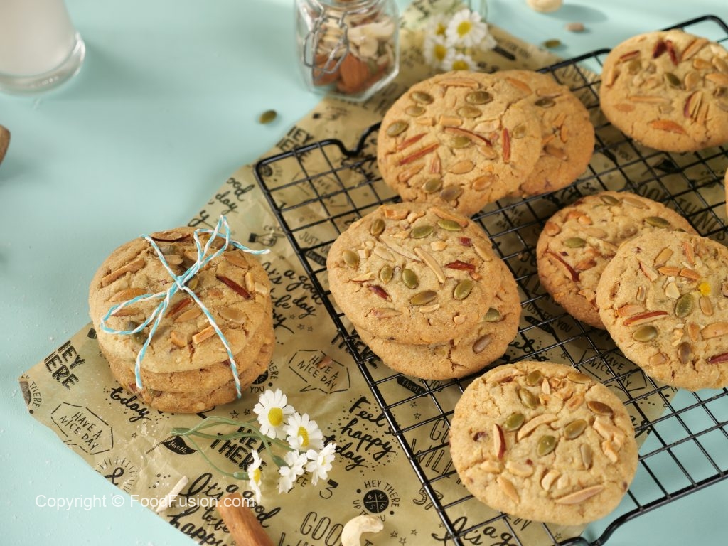 -Take a small dough (50g),make a ball & press gently to make a cookie shape & press the cookies on mixed nuts from one side (makes 15).