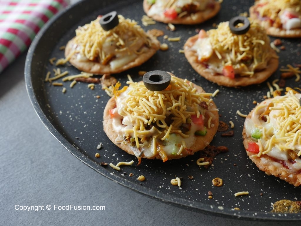 Papri per pizza sauce dal ker pheela lein,cooked chicken,shimla mirch,pyaz,tamatar,cheddar cheese, mozzarella cheese,lal mirch crushed aur dried oregano dal ker dahk dein aur halki ancch per cheese melt hunay tak paka lein (2-3 minutes).