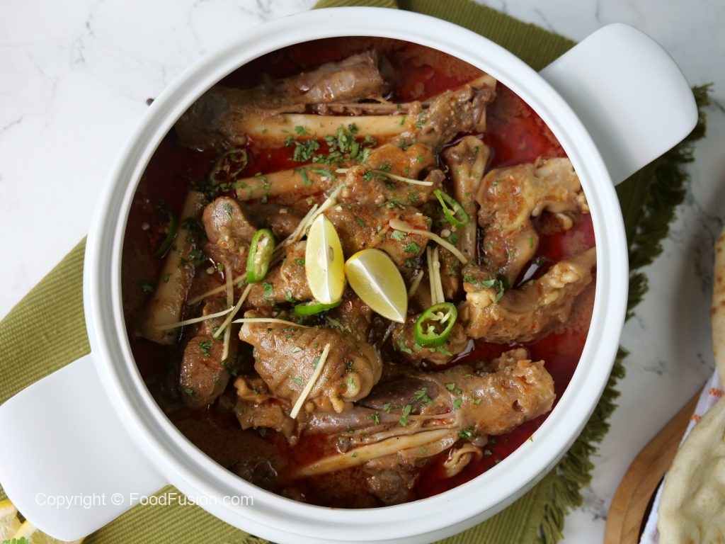 -Serving dish mein paya nihari aur tarri dal dein,hara dhania,adrak,hari mirchein aur lemon sa garish ker ka serve karein!