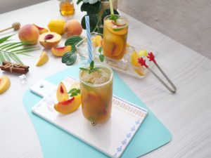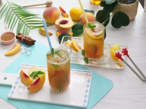 -Serving glass mein ice cubes,peach slices,tayyar green tea (3/4 cup),tayyar peach mixture (1/4 cup) aur podina dal ker stir ker lein.
