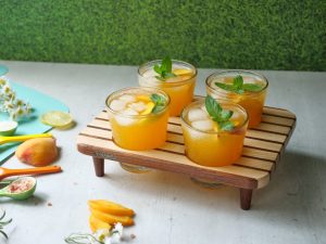 -Serving glass mein ice cubes,peach slices,tayyar peach drink aur podina dal kar serve karein!