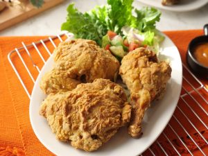 Crispy air fried chicken ko sauce & salad ka sath serve karen.