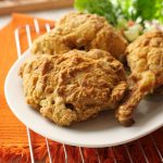 Serve crispy air fried chicken with sauce & salad.