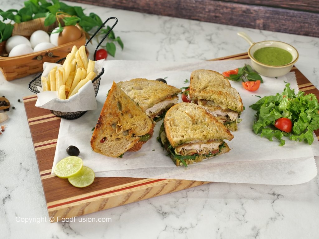 -Serve with potato fries,Pesto sauce & salad.