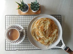 Grease hand with ghee and press gently to spread the dough to make a paratha (makes 4).