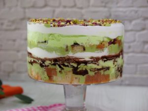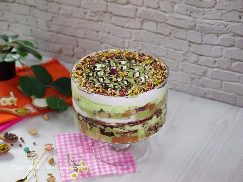 -Trifle bowl mein sabse pehle plain cake dal kar spread karein,phir sugar syrup,chocolate syrup,pista sauce,dried rose petals,pistachios,almonds aur ice cream slices daal kar layer banayein.