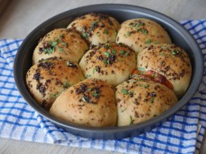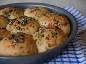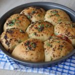 Apply garlic herded butter and bake in preheated oven at 180 C for 20-25 minutes.