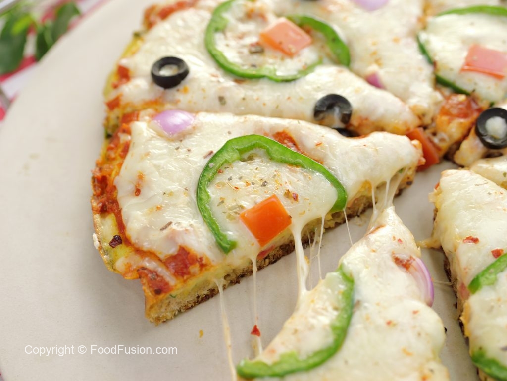 -Pizza sauce dal ker pheela lein,cheddar cheese,mozzarella cheese,shimla mirch,tamatar,pyaz aur black olives dal dein.