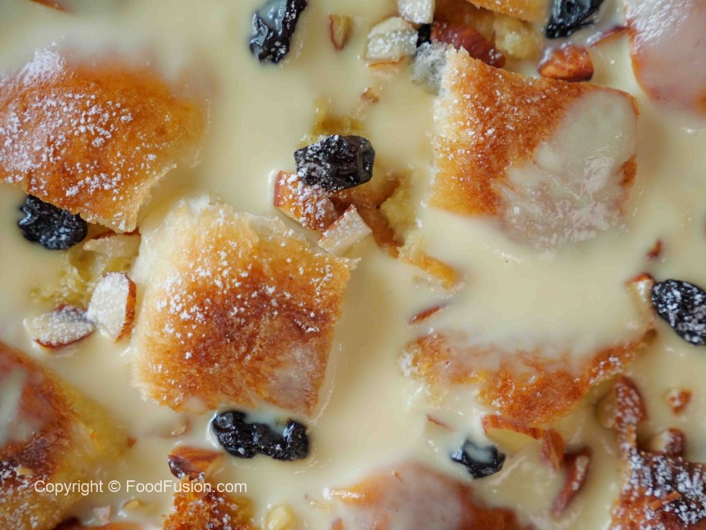 -Pour vanilla custard sauce on bread pudding, garnish with icing sugar & serve!