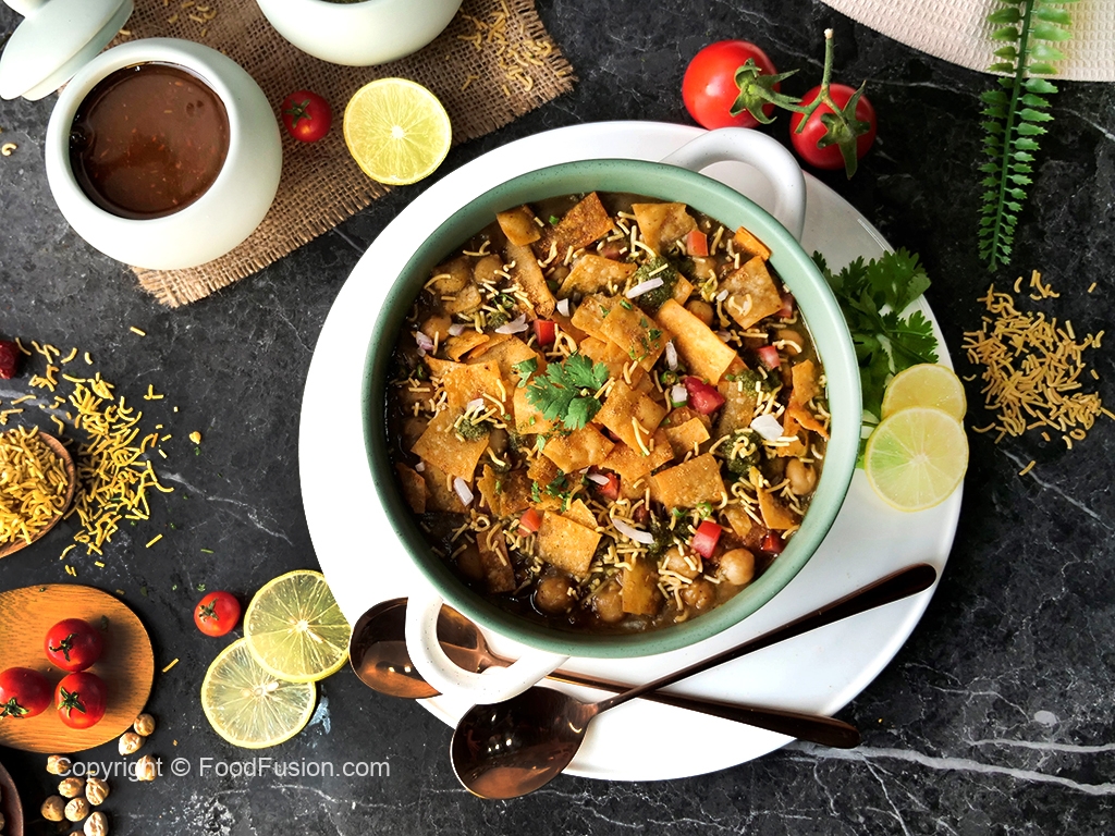 Serving dish mein radga chaat,pyaz,tamatar,hari mirch,spicy green chutney,tamarind sauce,sev nimco,papri,hara dhania aur chaat masala dal ker serve karein!