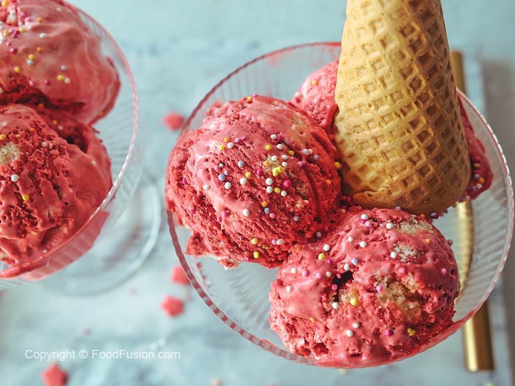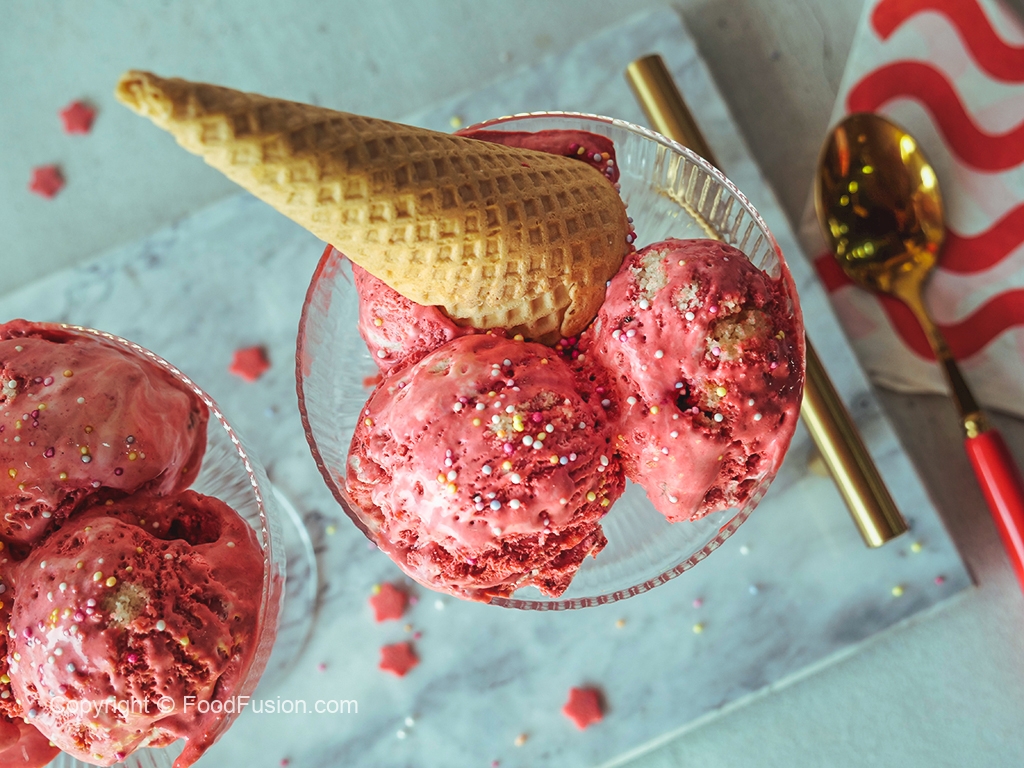 Skewer ki madad sa gently swirls bana lein,ice cream ki surface ko butter paper sa cover ker lein aur dhak ker 8 hours ya overnight kliya freeze ker lein (yields: 2.5 litres).