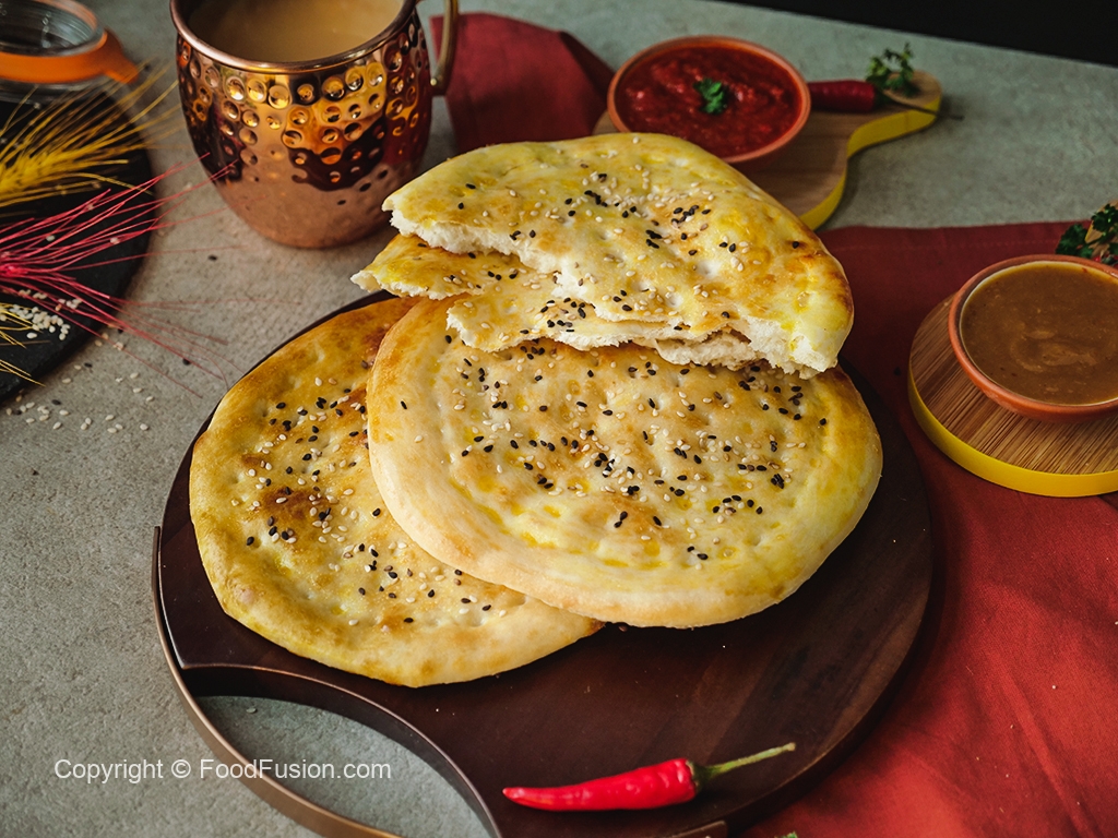 Brush ki madad sa naan per laga lein aur kalay & safed til chirak dein (makes 4).