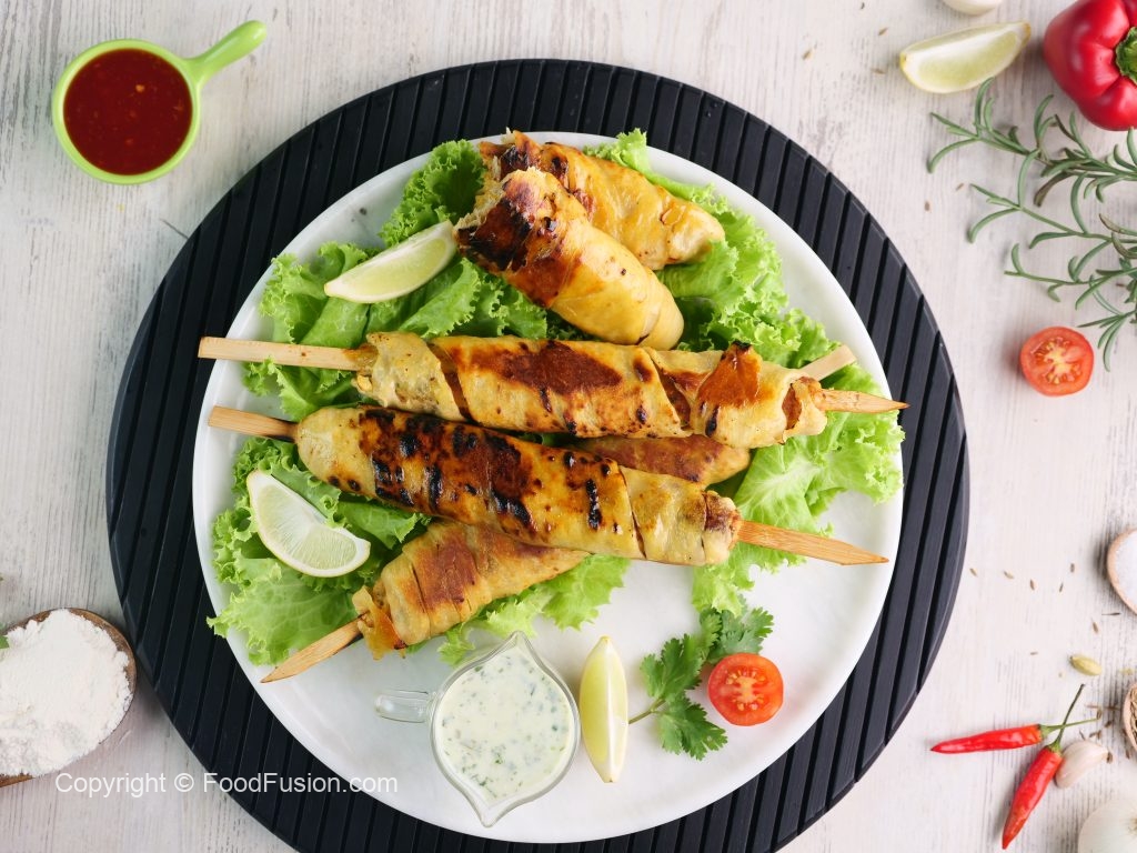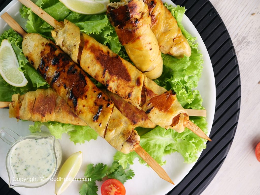 -Heat griddle & cook wrapped skewers on low flame from all sides until golden then fire roast on direct flame until its charred from all sides.