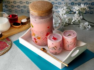 In a jug,add milk,rose syrup,condensed milk,whisk well & set aside.