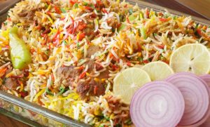 Spread dissolved red food color,green food color,orange food color & yellow food color,mint leaves, fresh coriander,fried onion,cover & steam cook on low flame for 18-20 minutes.