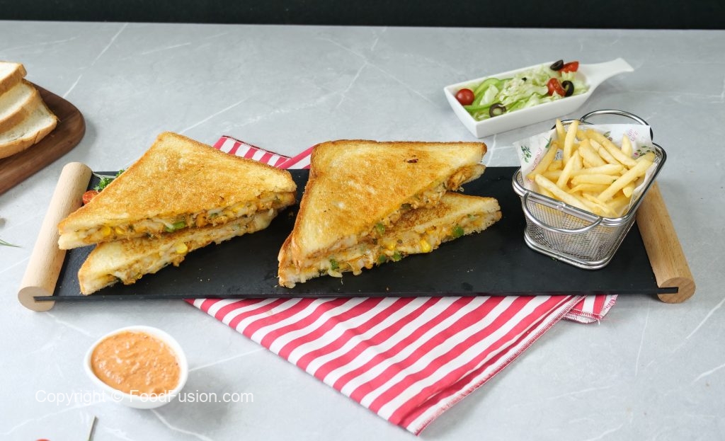 -On two large bread slices,apply butter,add & spread prepared filling on one bread slice & flip the other bread slice & apply butter.