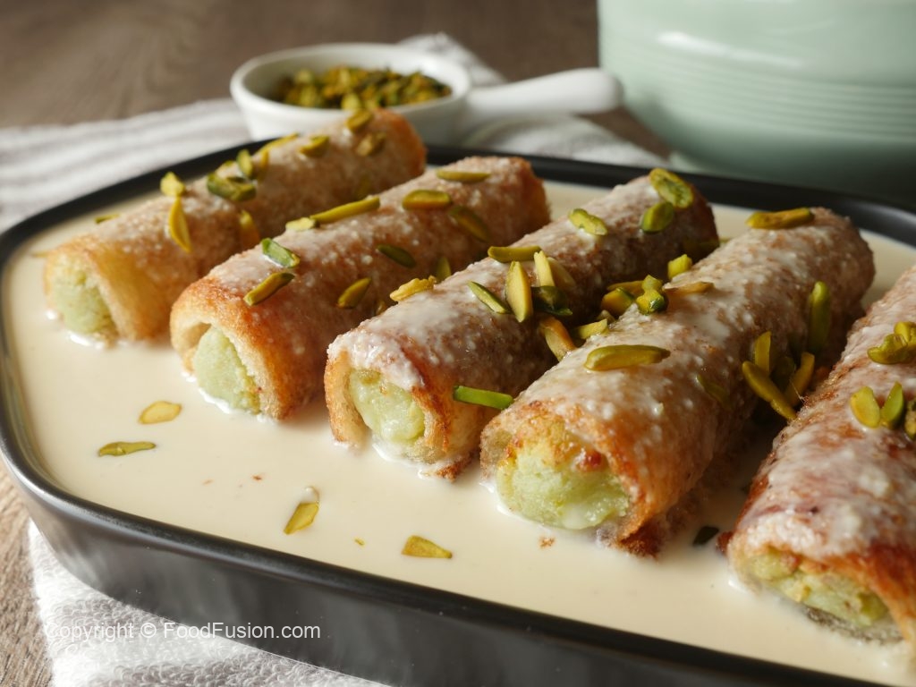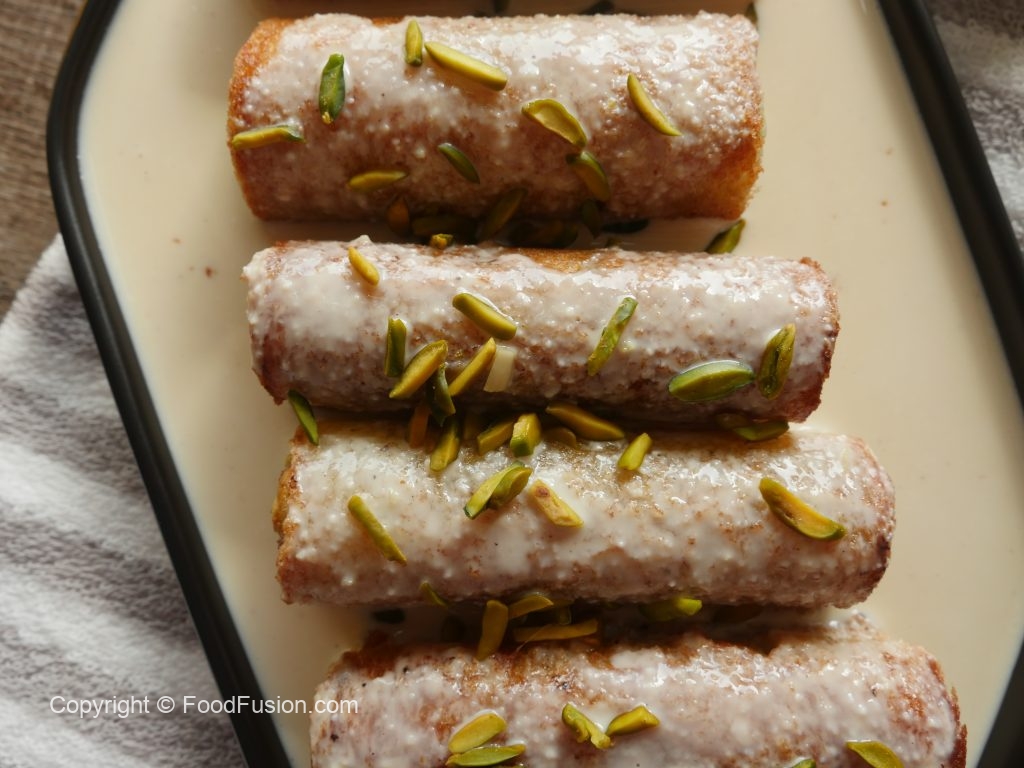Serving dish mein bread rolls ups rakh dein aur neem garam doodh dal dein.