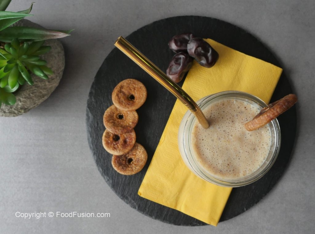 In jug,add figs,dates (deseeded) and milk,mix and soak for 4 hours or overnight in refrigerator.