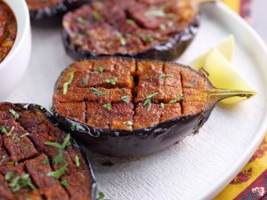 -Baingan ko half mein cut ker lein phir usmein vertical aur horizontal cuts lagayein aur tayyar spice mix dal dein (reserve for later use).