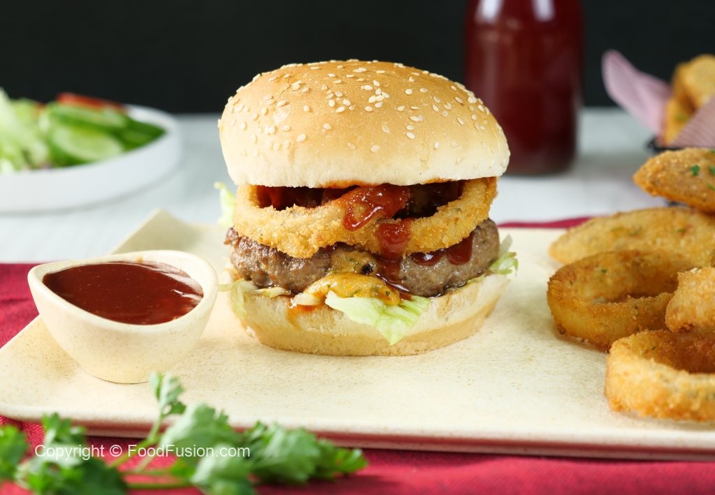 -On a burger bun,add & spread tomato ketchup,add iceberg leaves,beef patty,crispy onion rings,tomato ketchup & cover with top burger bun & serve with prepared crispy onion rings & potato wedges (makes 4).