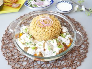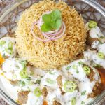 On serving dish,add prepared pulao,kabab with gravy and yogurt.
