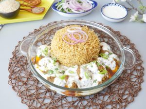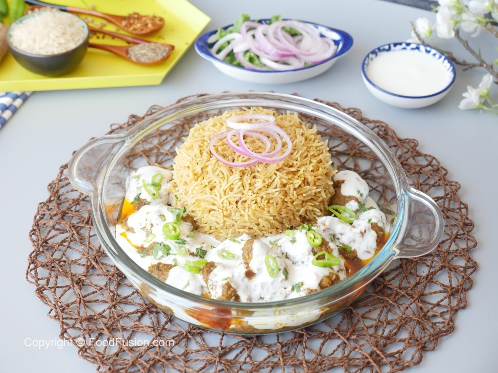 Serving dish mein tayyar pulao,kabab with gravy aur dahi dal dein.
