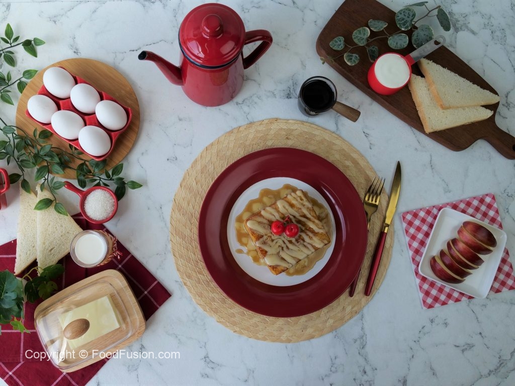 -On french toast,drizzle vanilla cream sauce,pancake syrup,garnish with cherries & serve!