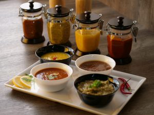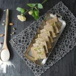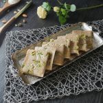 On greased tray 9 x 12“(with ghee),add prepared sooji mixture,desiccated coconut,almonds,pistachios & press firmly.