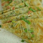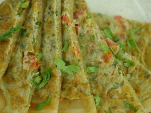 In jug,add eggs,onion,tomato,green chili,fresh coriander,red chili crushed,salt,cumin seeds and coriander seeds,whisk well & set aside.