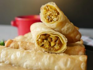 Samosa sheet/manda patti lein aur tayyar filling dal ker tamam sides ko fold ker ka roll ker lein aur maida ka paste laga lein.