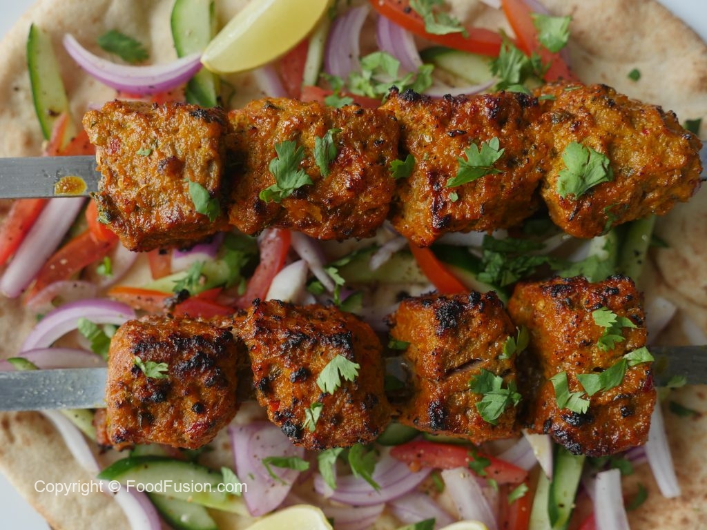 -Marinated meat ko skewers per laga lein.