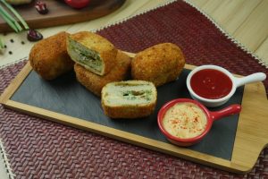 Now dip into beaten eggs and coat with breadcrumbs then again dip into beaten eggs and coat with breadcrumbs (makes 6).