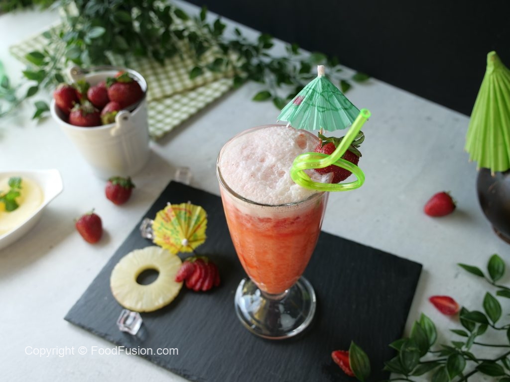 -In a serving glass,add ice cubes,prepared strawberry puree (3-4 tbs),prepared pineapple & coconut milk (3-4 tbs) & 7up.