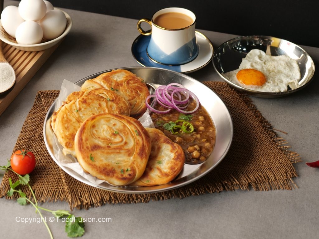 Bun paratha ko chanay ka salan, half fry anda ya chaye ks ath serve karen!
