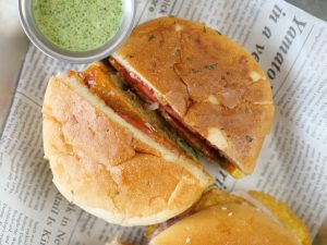 -On same griddle,add clarified butter & let it melt,cut bun from the middle & toast bun from both sides.