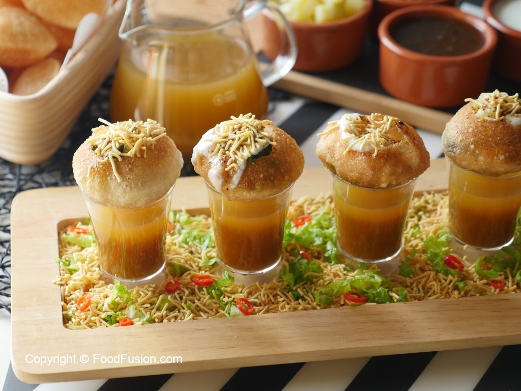 Poke gol gappa from the center,add chickpeas,potato & whole green gram,spicy green chutney,yogurt, prepared meethi chutney,sprinkle chaat masala,nimco sev & serve with prepared minty khatta pani!