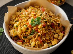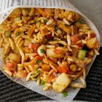 In a bowl,add roasted puffed rice,cucumber,onion,chickpeas,tomato,potato,green chilli,ginger,nimco mix,pickled oil,prepared spice mix,fresh coriander,lemon juice & mix well.