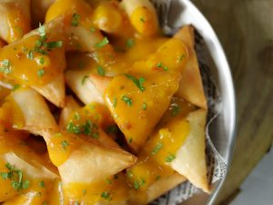 -Cut samosa sheet,make a pocket,add prepared potato filling (1 tsp) & roll into the shape of samosa and seal corners with all-purpose flour slurry & reserve remaining potato mixture for chutney.