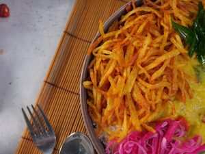 -In a serving bowl,add rice,daal,crispy aloo,prepared teekhi chutney,pickle onion,fried curry leaves & serve!