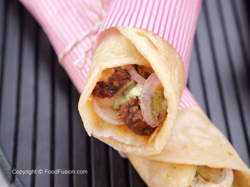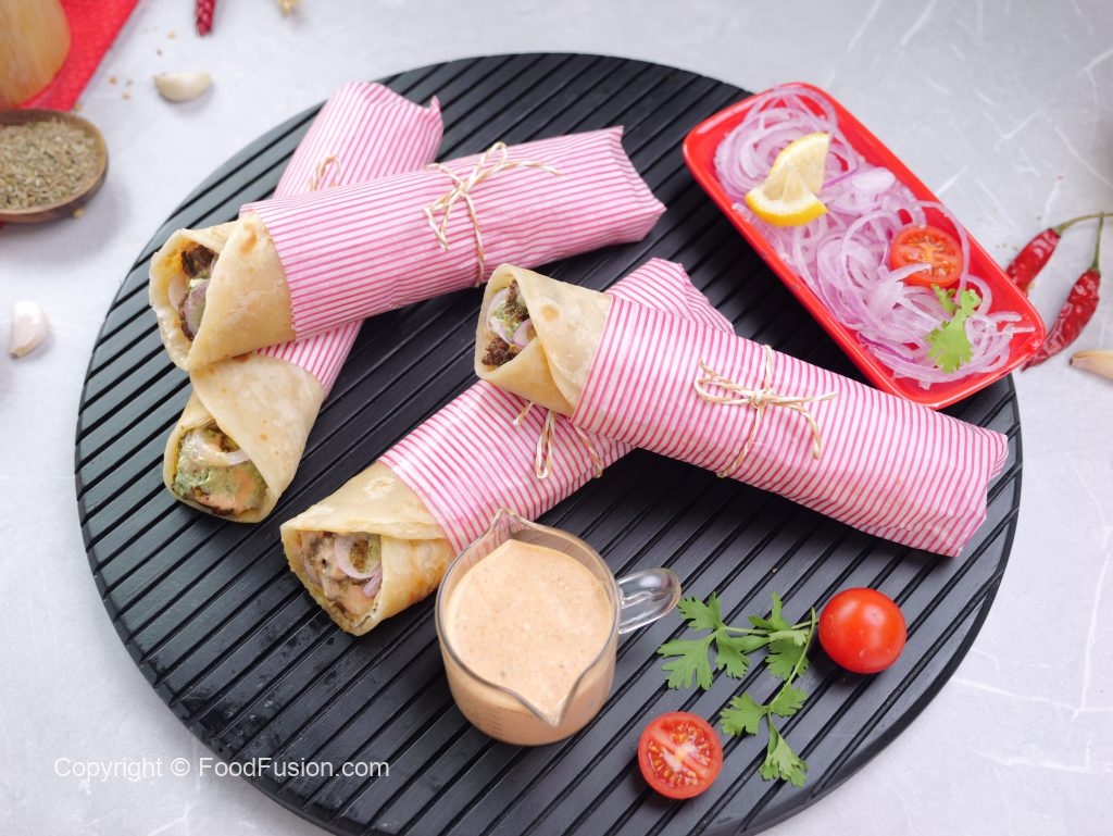 -On a paratha,spread mayo sauce,cooked beef cubes,onion rings,green chutney,mayo sauce,warp in butter paper & serve (makes 4-5).