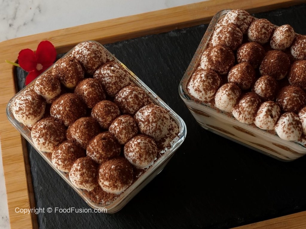 In serving cups,add a layer of prepared cheese & cream mixture,add coffee dipped biscuits one by one and add another layer of cheese & cream mixture,sprinkle cocoa powder on top.