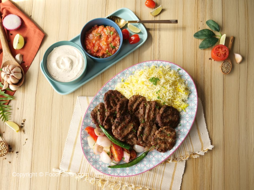 -Kofta kebab ko saffron butter rice,grilled vegetables & tahini yogurt sauce ka saath serve karein.