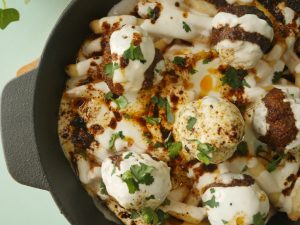 On serving dish,add potato fries,cooked meat balls,garlic yogurt,pour heated meatballs oil,fresh coriander & serve!