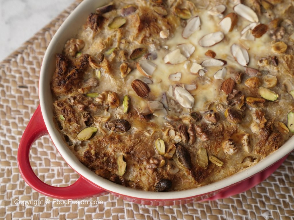 Baking dish mein puff pastry ko break ker ka dal dein,darchini powder,khopra,kishmish, hazelnuts, akhrot,pista,tayyar doodh dal dein aur upper sa cream aur badam dal dein.