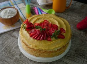 Remove from frying pan and place the crepe on a kitchen towel so that it will not stick & allow the layers to cool down completely at room temperature before stacking them (makes 15).