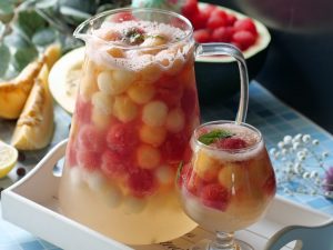 In a pitcher,add melon balls,watermelon balls,honeydew melon balls,prepared juice,7up,mint leaves,stir & serve!