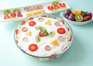 In serving dish,add banana,mango,strawberries,kiwi,prepared yogurt fruits & serve!